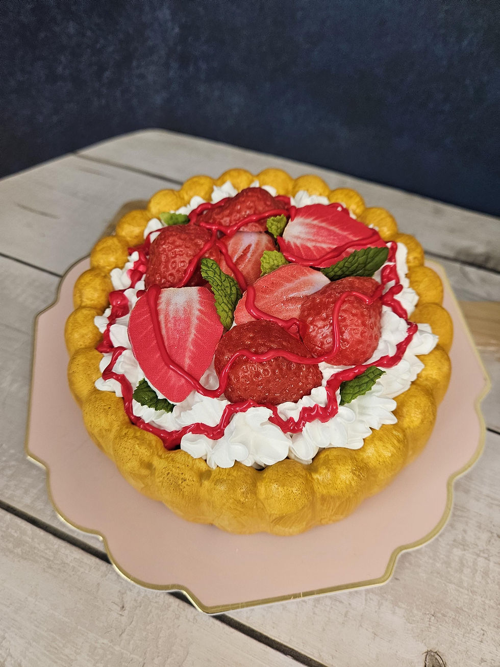 Faux Strawberry Shortcake with fake lady finger crust, prop food, display cake